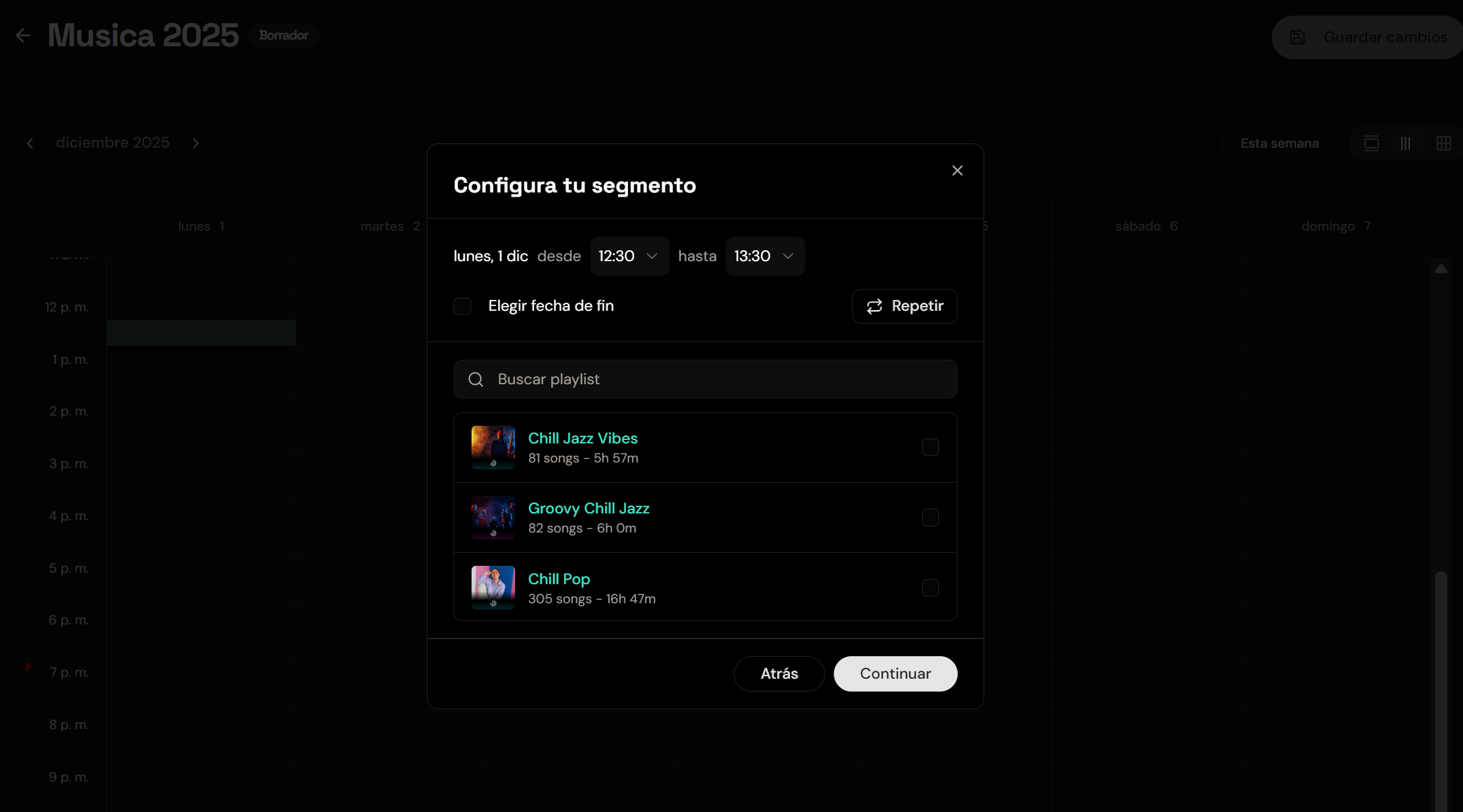 Importante: Para que nuestro segmento suene diariamente o en determinados días, debemos presionar sobre "repetir" y seleccionar los días a sonar. Una vez configuramos nuestro segmento, le damos al botón de continuar.