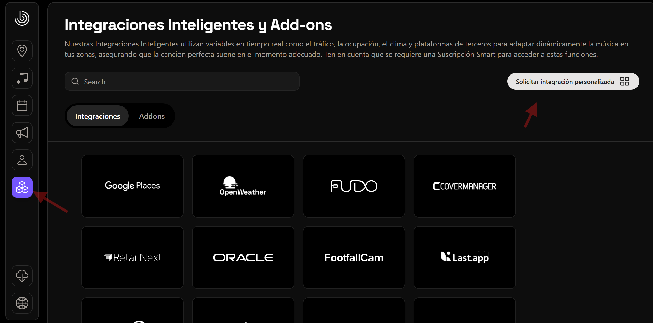 ⚠️ Importante: para que la Playlist Smart funcione correctamente, la fuente de datos debe estar activa y configurada. Por ejemplo, si querés que la música se adapte según la ocupación usando Google Places, tu tienda debe estar correctamente registrada en Google Places. Si querés usar datos de reservas o clima, esas integraciones deben estar conectadas previamente.